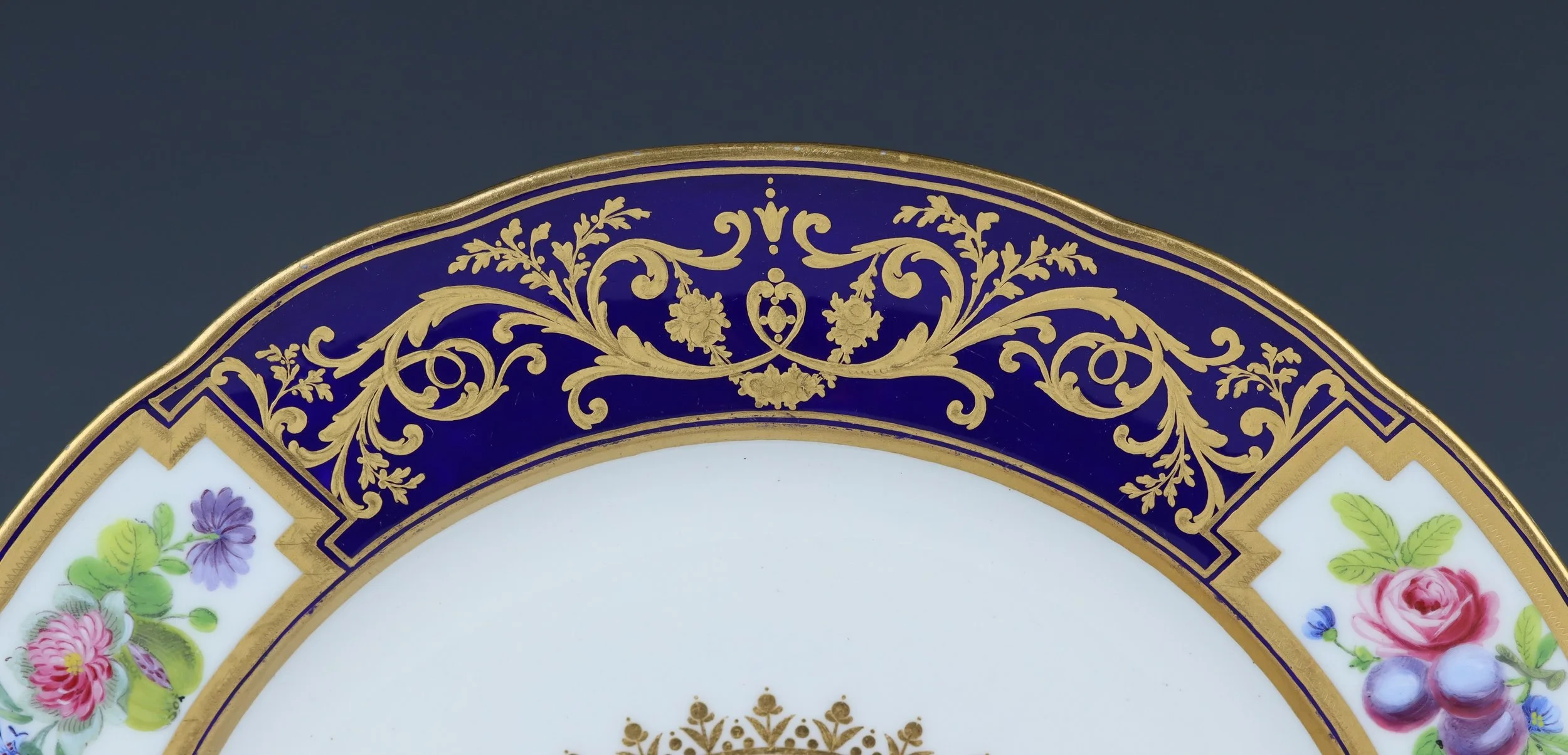 A major part of the service subsequently appeared in an auction at Christie’s in London on 11 March 1836, with this description: “A splendid dessert service of the rarest Sèvres porcelain, Bleu du Roy, exquisitely painted with groups of fruits and flowers, purchased at the sale of the property of Don Carlos in his apartments at the Palace of Madrid”.