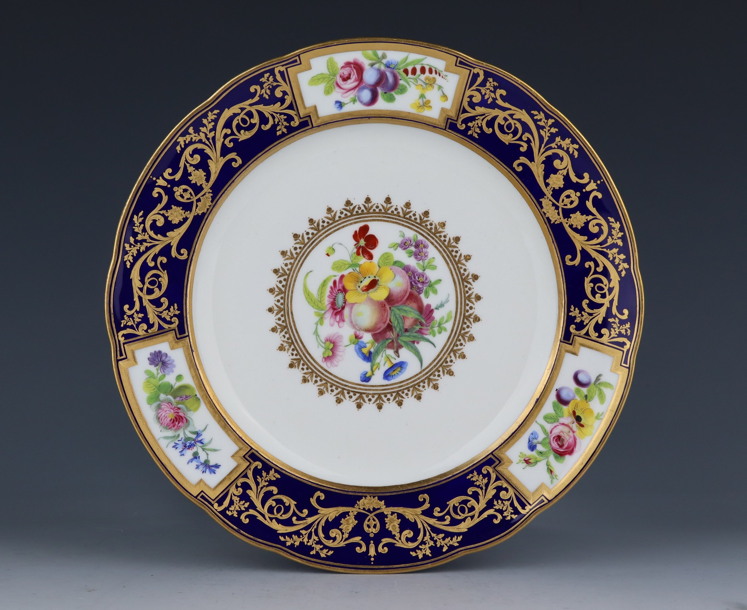 Sèvres plate decorated with rich gilt arabesques on a bleu nouveau ground and panels of flowers, 1787